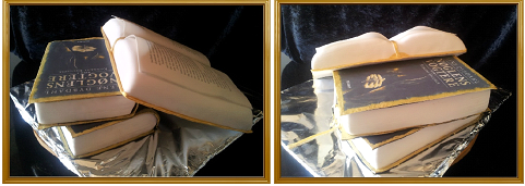 8. Så har man en åben bog, og nu skal den pyntes. Her har jeg valgt at printe 2 sider ud (spiseligt print og fondantpapir). Det kan bestilles over nettet. Jeg har lavet et bogmærke af fondant og farvet kanten og bogmærket guld.